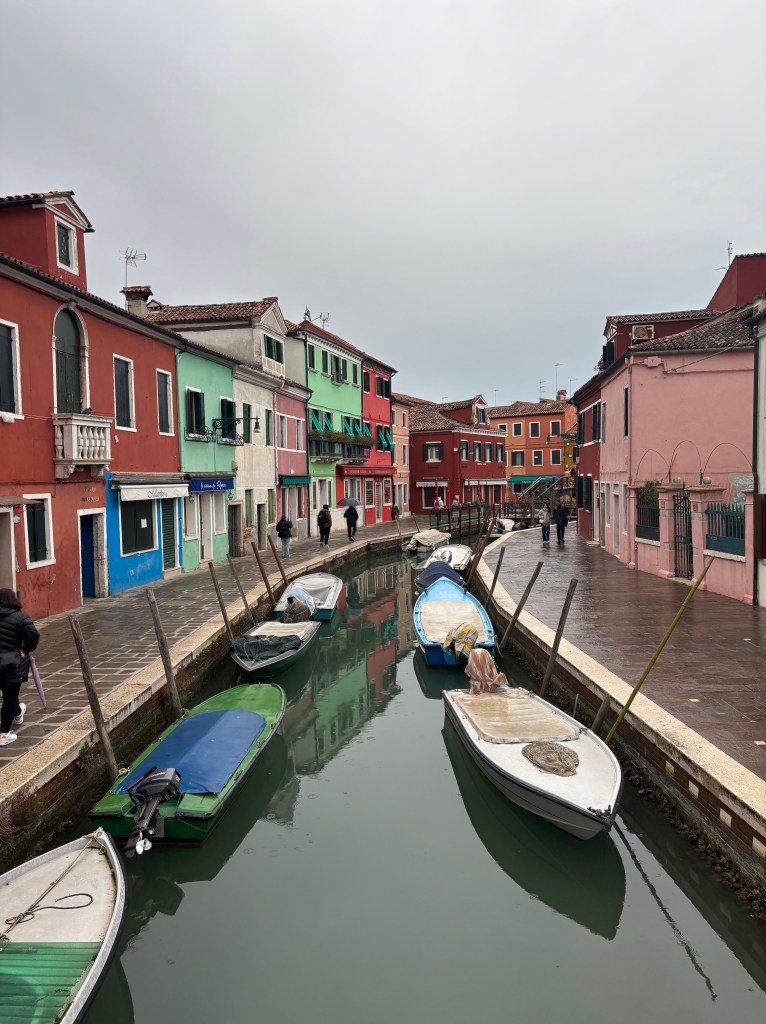 On Saturday, we headed to Venice for the night. We walked the strip and had dinner at a restaurant sitting aside a canal. This might have been my favorite part with them because it was such a vibe. The patio was beautifully set, with heaters warming us from above, a personal guitarist serenading us with banger after banger. We sipped on espresso martinis, indulged in delicious pesto ravioli, and enjoyed each others company—all while soaking in the magic of Venice. Later that night my sister, Brynn, and I set off in search of a bar. We stumbled upon a jazz spot where bras were strung across the ceiling, lively music filled the air from every direction, and it seemed like every study abroad student in town had gathered there that night. We discovered new shot combinations. My favorite being the White Russian and hers being the Lemon Drop. The next morning, we took a ferry to Bergamo. Unfortunately, the weather wasn’t on our side, so most places were closed when we arrived. Still, the rainbow-colored buildings were super cute.