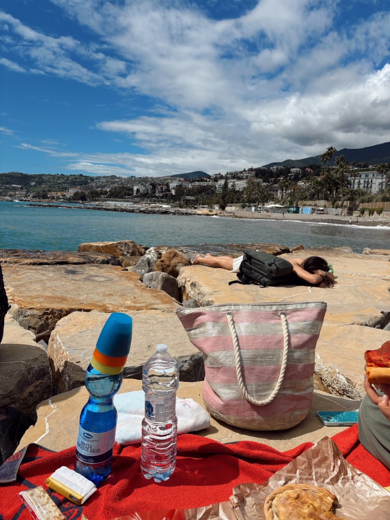 As soon as Easter break began, my family and I made our way to their house in Sanremo. This time, the town radiated that unmistakable beachside charm—clear blue skies, gelato shops on every corner, and the kind of warm weather that instantly lifts your mood. On our first day, we picked up some fresh Sardenaira, a local Sanremo specialty—essentially focaccia topped with red sauce and olives—and had a seaside picnic. We lingered there for hours, soaking in the stunning views and basking under the high UV sun. I brought along my new Italian book, How the Grinch Stole Christmas. It was the first book I ever read on my own in English, so I wanted it to be my first in Italian too.